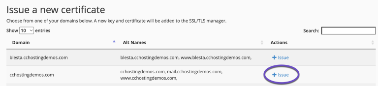 2) The next step is to issue a new SSL certificate for the desired domain name. Choose from one of your domains in the list, then click ‘Issue‘ under Actions.